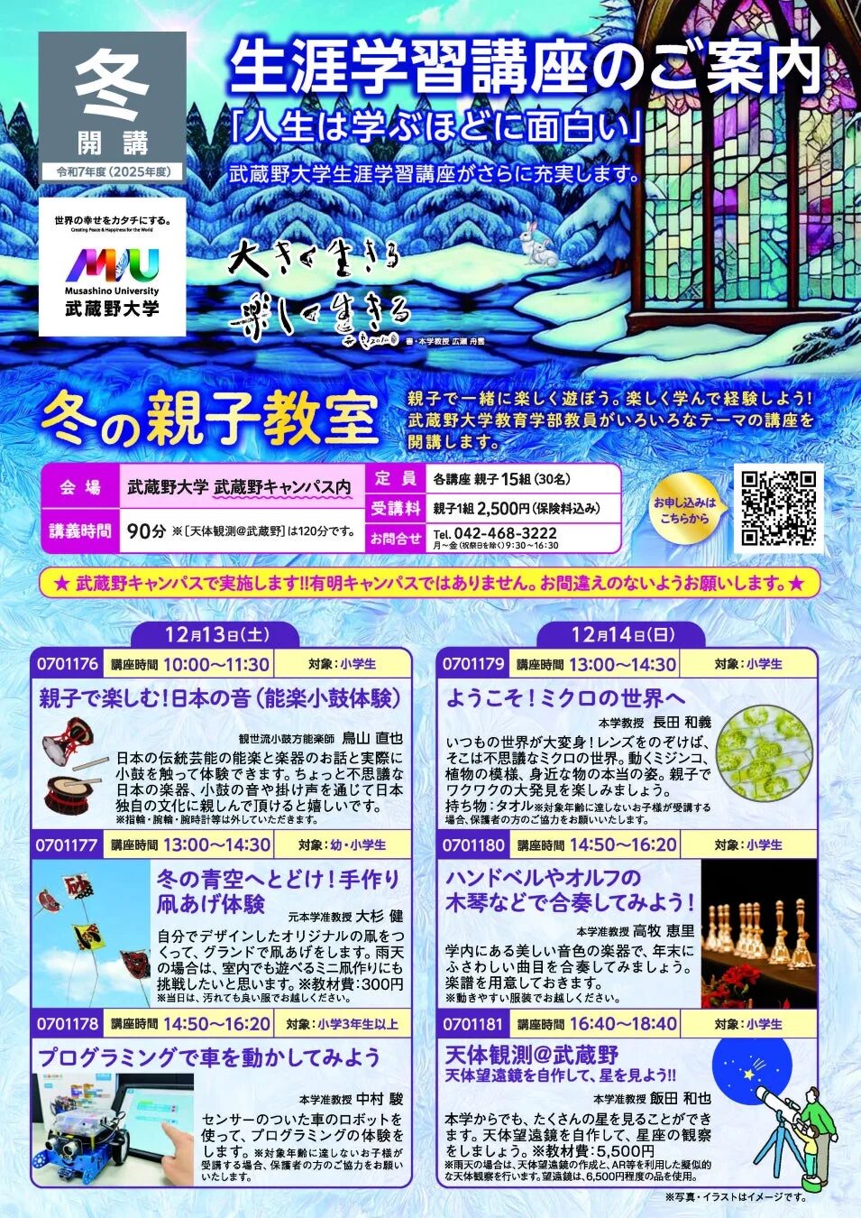 武蔵野大学は、あらゆる年代の「社会の担い手」育成の一環として、親子での学びを深める「冬の親子教室」を2025年12月13日(土)と14日(日)に開講します。教育学部の教員が工夫を凝らした全6講座が用意されており、日本の伝統芸能に触れたり、プログラミングで車を動かしたり、自作の望遠鏡で星を観察したりと、親子で一緒に楽しめる多彩な体験ができます。