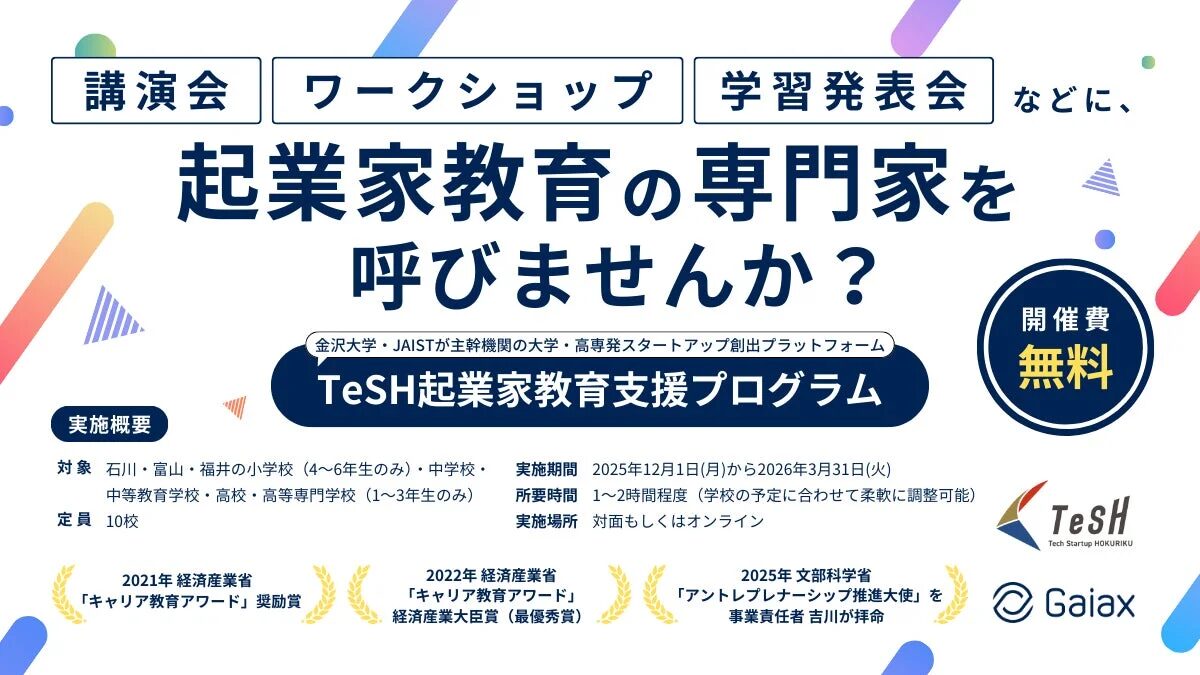 株式会社ガイアックスは、北陸地域(石川・富山・福井)の大学・高専が連携するスタートアップ創出プラットフォーム「Tech Startup HOKURIKU(TeSH)」の取り組みとして、「TeSH 起業家教育支援プログラム」を開始しました。このプログラムでは、小学校(4〜6年生のみ)、中学校、中等教育学校、高校、高等専門学校(1〜3年生のみ)を対象に、起業家教育の専門講師を無料で派遣してくれるんです。