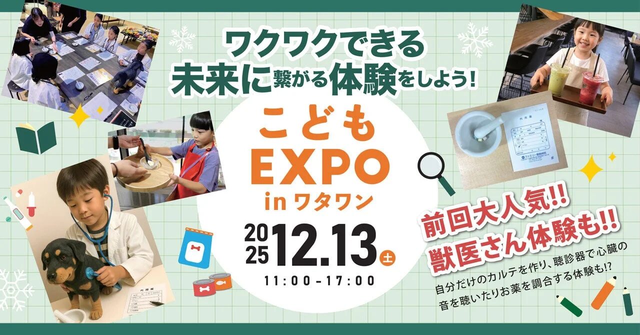 2025年12月13日(土)にWHATAWON(ワタワン)にて、子どもたちが様々な「おしごと体験」に挑戦できる参加型イベント『こどもEXPO in ワタワン』が開催されます。子どもたちの好奇心や個性を育み、未来につながる“やってみたい!”を見つけることができる一日です。