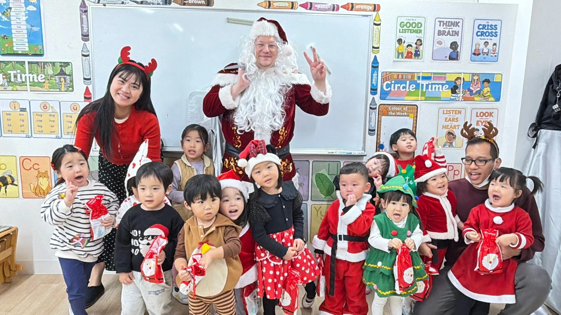 一日の終わりには、サンタクロースに扮した外国人講師がサプライズで登場し、子どもたちは一人ひとりプレゼントを受け取りました。輝く笑顔に包まれ、特別な一日が締めくくられました。