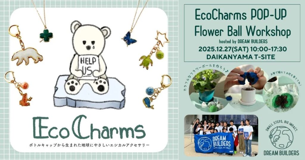 2025年12月27日(土)、小中学生環境保護活動チームDREAM BUILDERSが代官山T-SITEにて、ペットボトルのふたを再利用したアクセサリー「EcoCharms」のPOP UP販売と、親子で楽しめる「五感で楽しむFlower Ballづくりワークショップ」を開催します。子どもたちの創造力と遊び心が交わる場所で、未来を彩るエシカルな一日を体験できます。
