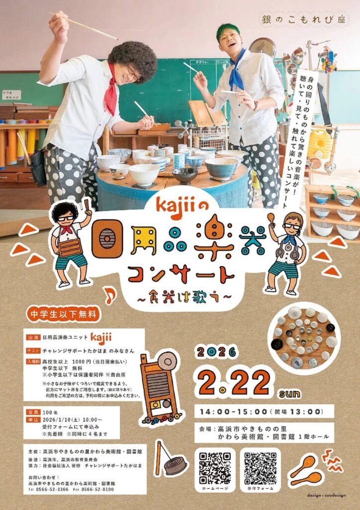 2026年2月22日(日)、高浜市やきものの里かわら美術館・図書館で、日用品演奏ユニットkajiiによる「日用品楽器コンサート ~食器は歌う~」が開催されます。身近な食器や空き缶などが奏でる驚きの音色と、観客も参加できる楽しいプログラムが魅力です。